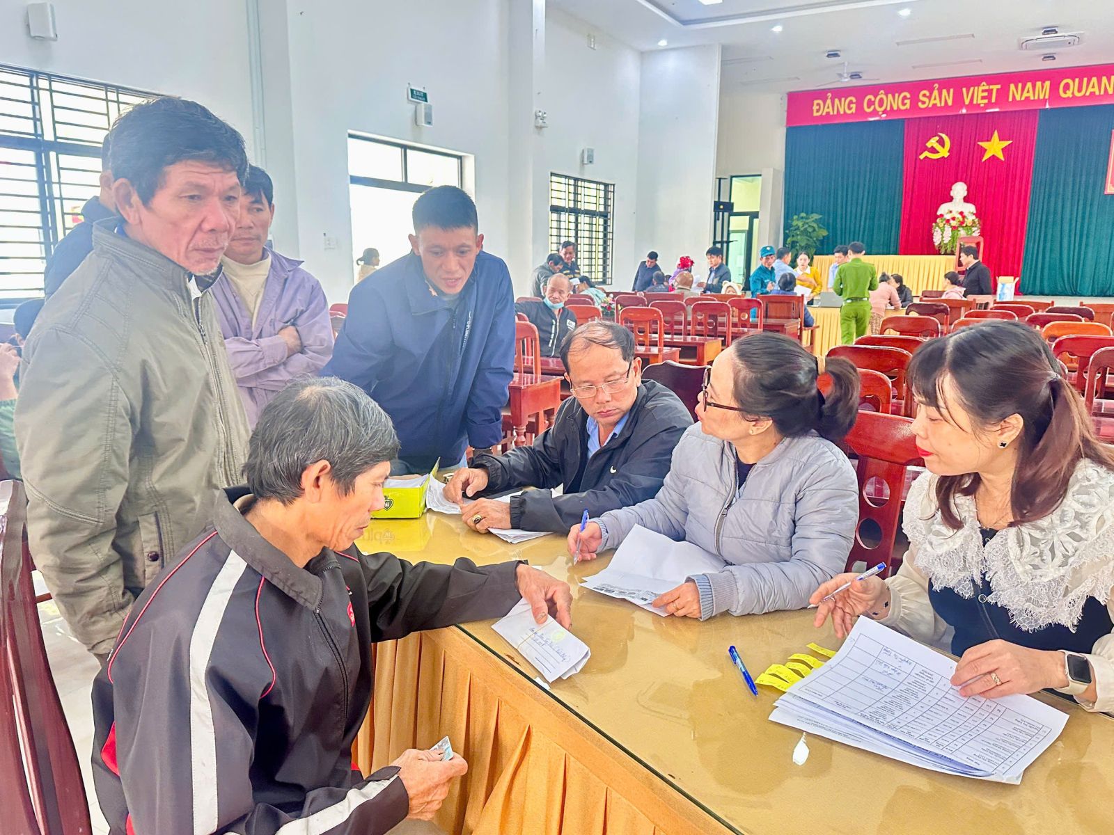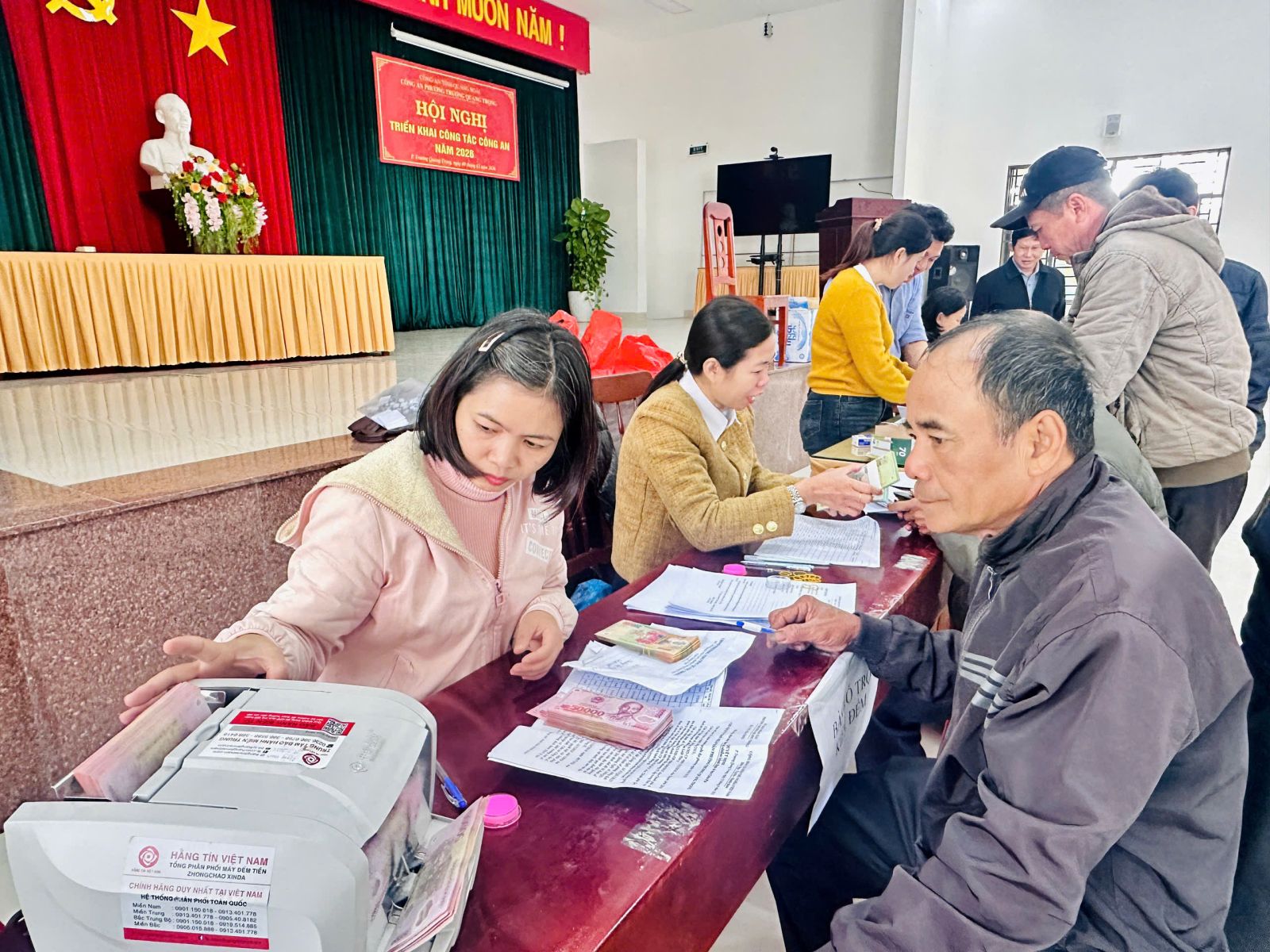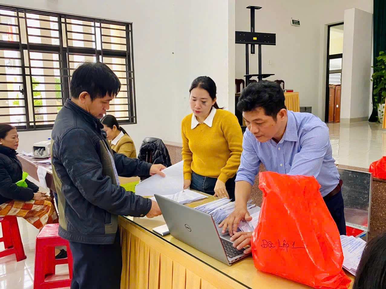 Các cán bộ, công chức, viên chức đang tiến hành chi trả tiền cho các cơ sở sản xuất