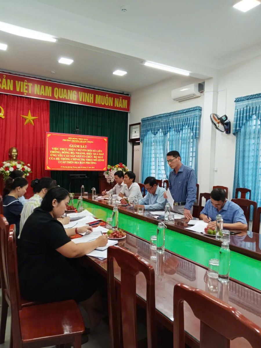 Sáng ngày 18/11/2025, tại Phòng họp UBND phường Trương Quang Trọng, Đoàn giám sát của HĐND phường đã tiến hành cuộc họp giám sát về công tác thúc đẩy chuyển đổi số liên thông, đồng bộ, nhanh, hiệu quả đáp ứng yêu cầu sắp xếp tổ chức bộ máy của hệ thống chính trị phường. Cuộc họp được triển khai theo Kế hoạch số 08/KH-HĐND ngày 27/10/2025 và Thông báo số 01/TB-ĐGS của Đoàn giám sát.