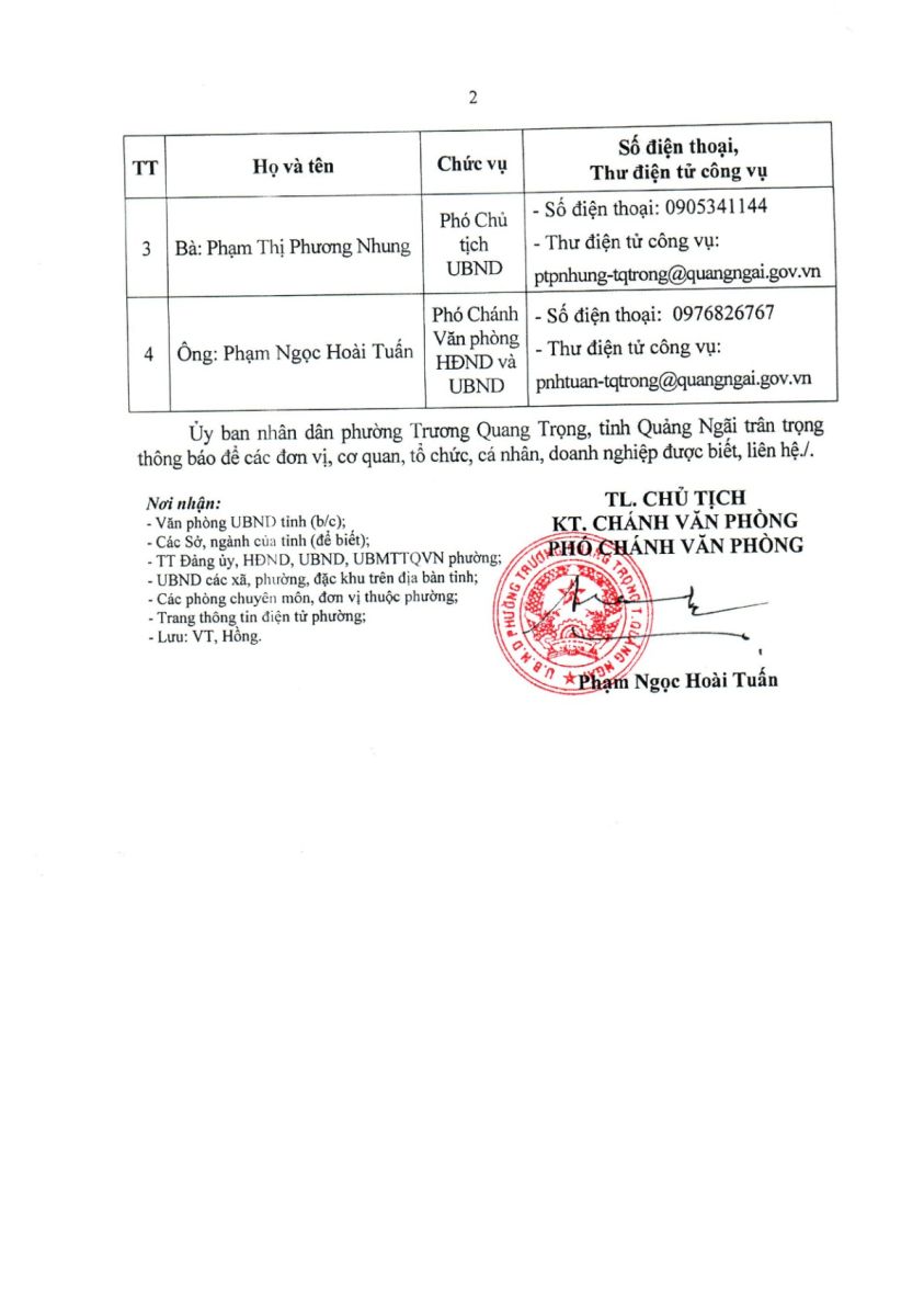 Thông báo số điện thoại và đường dây nóng tiếp nhận phản ánh kiến nghị về hành chính trên địa bàn phường Trương Quang Trọng